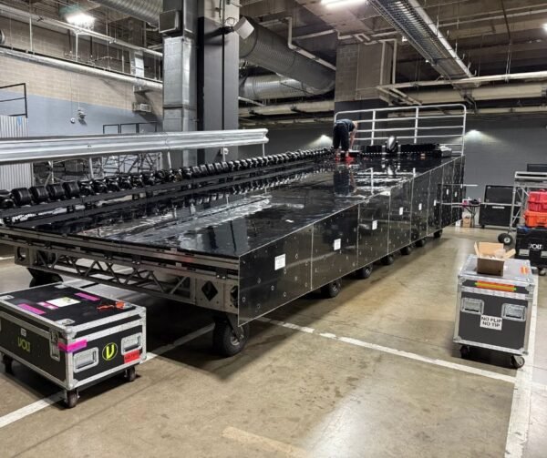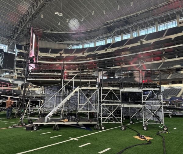 This year, Post Malone delivered a three-song set on our main field stage — a multilevel rolling stage finished with custom fabricated fascia and scenic details. With just minutes to roll a multi-level stage onto the field, every detail matters to make the stage a showstopper.